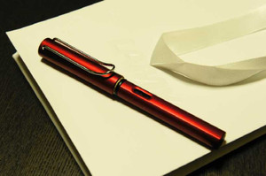 <デザイン惚れ込んでドイツのLAMYにしました。色はマットの赤です。お店で試しがきすると滑るように滑らかに書けるではありませんか(笑)。その感触に満足し即購入しました。>