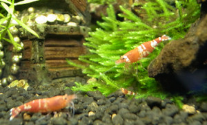 <大きなエビ(といっても3cmほどですが(笑))の間に5mmほどの紅白のシマシマ。産まれた小エビです。今のところ三匹確認しています。親は5匹買ってきましたが昨日時点で4匹生存が確認されています。大が4匹。小が三匹。買ってきた時点より増えると嬉しいですねぇ~(笑)>